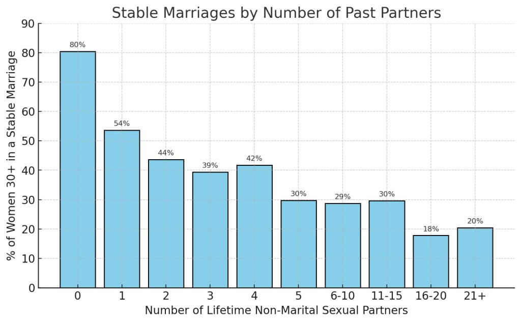 Wie oben dargestellt, über 80% der Frauen mit 0 vorehelichen Partnern (Jungfrauen, die ihren ersten Sexualpartner geheiratet haben) waren im Alter von 30+ in einer stabilen EheBei Frauen mit 5 früheren Partnern sinkt diese Zahl auf etwa 30% und bei Frauen mit 16-20 Partnern auf unter 20% . Mit anderen Worten: Eine hohe Zahl früherer Partner ist stark mit einer höheren Wahrscheinlichkeit des Scheiterns einer Ehe verbunden.