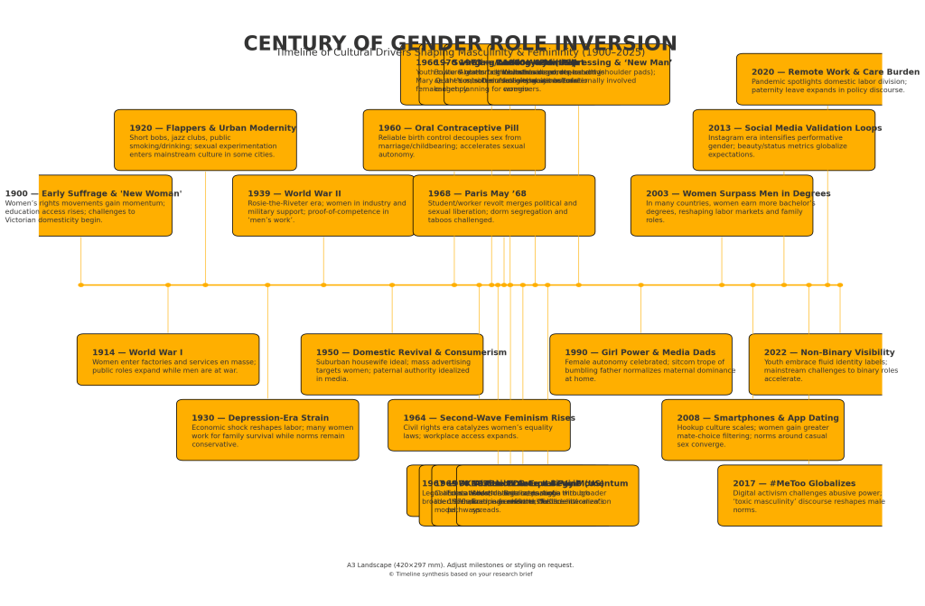 Les conséquences à long terme de cette inversion des rôles sont complexes et toujours en cours d'élaboration. D'une part, les gains sociaux sont évidents : une plus grande égalité entre les hommes et les femmes est corrélée à un développement économique plus important, à une plus grande innovation et à une plus grande liberté individuelle. La libération des femmes a amélioré les résultats en matière de santé, d'éducation et de droits de l'homme pour environ la moitié de la population. La libération des hommes des contraintes liées à la "rigidité de la lèvre supérieure" a sans doute conduit à des vies émotionnelles plus riches et à la possibilité d'être des soignants et pas seulement des pourvoyeurs. Dans de nombreuses études, les familles dans lesquelles les partenaires partagent les rôles ont tendance à faire état d'une plus grande satisfaction relationnelle et d'une meilleure adaptation des enfants. Toutefois, ces changements entraînent également une plus grande satisfaction dans la relation et une meilleure adaptation des enfants. de nouvelles tensions et de nouveaux défis. Le modèle traditionnel de la façon de former une famille et de vivre sa vie a été déstabilisé, ce qui a conduit à ce que certains appellent l'ère de la famille "post-moderne". Les taux de mariage ont chuté dans de nombreux pays (par exemple, les milléniaux sont beaucoup moins nombreux à se marier que leurs grands-parents), et ceux qui se marient le font plus tard et davantage en tant que famille. choix qu'une nécessité. Les taux de natalité ont chuté dans les sociétés développées, en partie parce que les femmes qui ont reçu une éducation et une carrière choisissent d'avoir moins d'enfants et plus tard dans la vie. Cela soulève des inquiétudes démographiques et économiques quant au vieillissement des populations et des forces de travail. L'incidence plus élevée du divorce et de la monoparentalité, tout en reflétant la liberté personnelle, signifie également que de nombreux enfants grandissent avec un seul parent, ce qui peut exacerber les tensions financières et sociales (souvent, les mères assument la monoparentalité - un fardeau ironique de la "libération"). En outre, certains hommes se sont efforcés de trouver une nouvelle identité dans un monde où les femmes n'ont pas de rôle à jouer. besoin Les hommes sont souvent considérés comme des pourvoyeurs ou des protecteurs au sens ancien du terme. Le phénomène de l'homme "fragile" ou "perdu" dans l'ère post-féministe est souvent évoqué - comme en témoignent, par exemple, les taux plus élevés d'abandon des études ou du travail chez les jeunes hommes, ou le fait qu'ils gravitent autour d'idéologies extrémistes qui promettent un retour à des rôles clairs. Parallèlement, les femmes sont confrontées à la pression de la "superwoman" : on attend d'elles qu'elles réussissent leur carrière, qu'elles aient un foyer parfait et qu'elles se conforment aux pressions de la société en matière de beauté et de maternité - une tâche ardue qui peut être source de stress et d'épuisement, ce qui indique que l'égalité dans le domaine de l'éducation et de la formation n'est pas encore une réalité. attentes a peut-être dépassé l'égalité dans les structures de soutien.