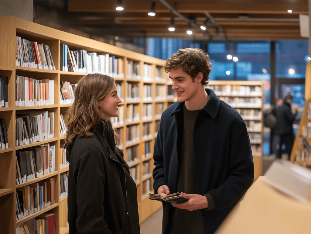図書館で相手に近づく良い方法は、相手がどのコーナーを見ているか、どんな本を読んでいるかを観察することだ。共通の関心事についてコメントしたり、本について丁寧に意見を求めたりすることで、有機的な会話への扉を開くことができる。図書館にいるほとんどの人は、集中したりリラックスするためにそこにいるのだから。タイミングが重要なので、彼女が本や勉強に深く没頭しているように見えない瞬間を選ぼう。